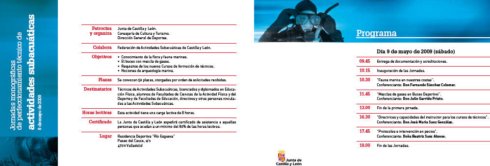 COMO EN AŅOS ANTERIORES DESDE LA JUNTA DE CASTILLA Y LEON, SE REALIZAN CURSOS PARA PERFECCIONAMIENTO DE TECNICOS, A LOS CUALES NUESTRA FEDERACION DE ACTIVIDADES SUBACUATICAS ESTA CITADA DESDE LA DIRECCION GENERAL DE DEPORTES PARA PODER REALIZARLOS. ESTE AŅO 2009 LA FECHA ASIGNADA ES LA DEL 9 DE MAYO, EL LUGAR DESIGNADO SERA LA RESIDENCIA DE LA JUNTA DE CASTILLA Y LEON RIO ESGUEVA, Y EL HORARIO SERA DE JORNADA DE MAŅANA Y TARDE: